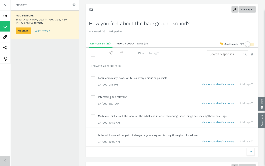 Compare to the previous exploration, this intervention is a relatively useful way to strengthen the audience’s connection and resonance when viewing the exhibition. The data shows that 50% of people think the background sound can help them get more into the paintings. And most people can understand what the artists tried to express correctly.